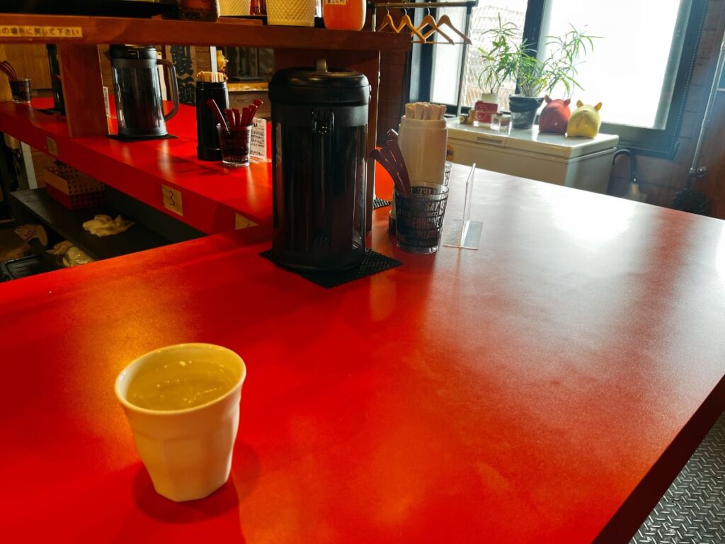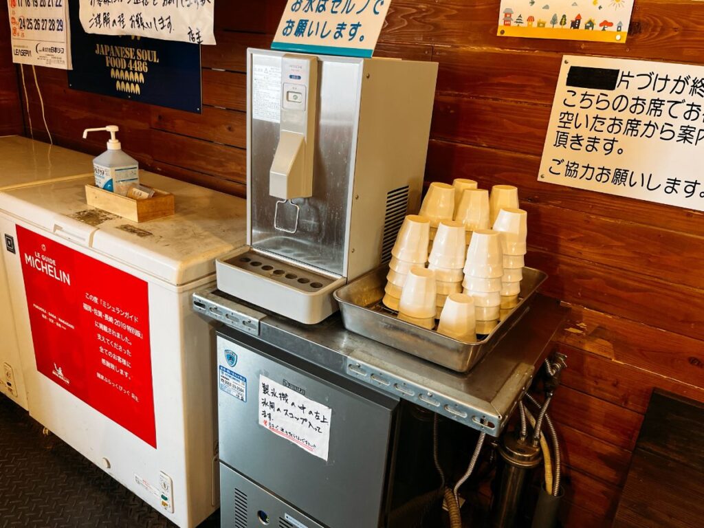 コの字カウンターのみです、15席くらい。ご夫婦2人でのオペレーションなのでうってつけ。お冷はセルフです、お店入ってすぐ左手にあります。店主さんの趣味で内装はアメリカンロカビリーな雰囲気で楽しいですよ。